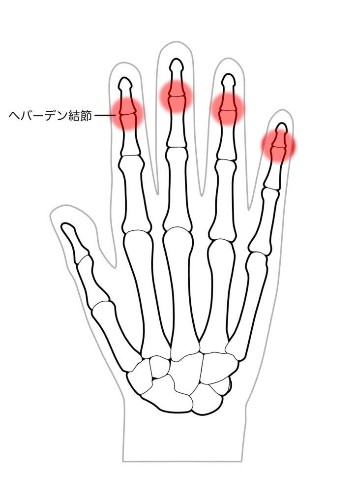 へバーデン結節は医学的に「変形性指関節症」に分類され、**DIP関節(指の第一関節)**に発生するのが特徴です。